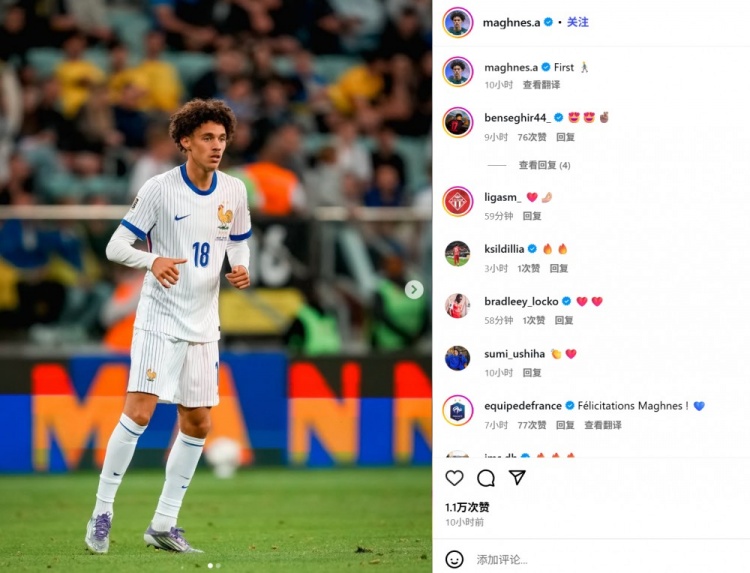 赛后他在社交媒体发布比赛照片并配文:“首次登场!”,法国队官方账号也在评论区送上祝贺。
