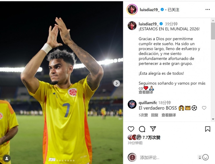 迪亚斯在社交媒体分享赛场瞬间并配文:“我们成功闯入2026世界杯!感恩上帝赐予我圆梦时刻。这条征程写满坚持与付出,我为身披国家队战袍而自豪。这份荣耀属于全体同胞!