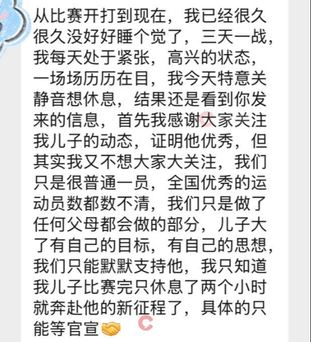 面对外界对儿子的关注,刘娟的心情是复杂的。她说,大家关注儿子的动态,说明他足够优秀,“但其实我又不想大家太过关注。我们只是很普通的一员,全国优秀的运动员数都数不清,我们只是做了任何父母都会做的部分。”